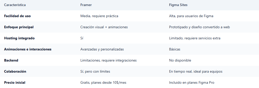 Aquí tienes una tabla comparativa con las principales diferencias entre Framer y Figma Sites para ayudarte a elegir el que mejor encaje con tu proyecto.