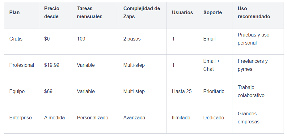 Zapier tiene varios planes pensados para que puedas elegir el que mejor se adapta a ti. Si quieres empezar, tienes una opción gratuita. Pero si buscas más potencia por un buen precio, el plan Professional suele ser el favorito de la mayoría.